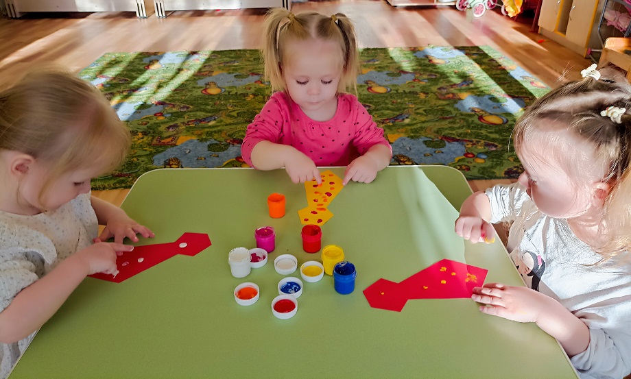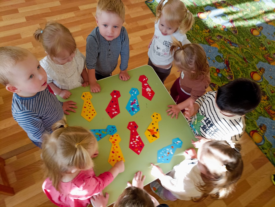 Малыши первой младшей группы "Одуванчик" с воспитателем Борисовой Ириной Викторовной изготовили для пап красивые поделки - яркие галстуки.