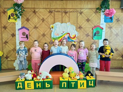 Дети групп "Почемучки", "Рябинка", "Затейники", "Ромашка" с музыкальным руководителем Плинковой Надеждой Николаевной отметили этот день яркими песнями и динамичными ритмическими композициями о весне и птицах, разгадывали загадки и поиграли в подвижные игры «Хитрый кот» и «Пёс Барбос». Дети запомнили, что правило "Птиц не губите, птичьи гнезда берегите!"
