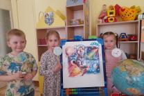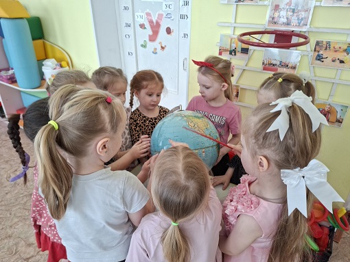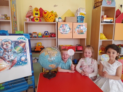 В средней группе "Солнышко" (ул. Ленина, 5) на занятии "Смотри на глобус, вот он шар земной" воспитатель Карпова Валентина Александровна познакомила ребят с глобусом, закрепила представления о внешнем облике Земли (горы, леса, пустыни, моря). Дети играли в игру "Быстрые ракеты", выполнили аппликацию "Наша планета Земля".