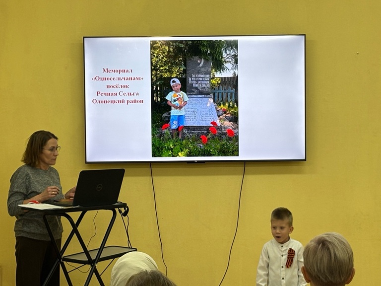 О подвиге героев нам напоминают памятные места, мемориалы, обелиски, монументы. Воспитанница подготовительной группы «Малышарики» Алина Кононова представила рассказ об одном герое, вернее героине – Павловой Анне. О своём пра-прадедушке нам рассказала воспитанница подготовительной группы «Непоседы» Колесова Арина. Воспитанница старшей группы «Ягодки» Милана Кумова рассказала о своём прадедушке. Историю героя своей семьи представили воспитанник подготовительной группы "Рябинка" Ругачев Костя с мамой Ириной Анатольевной. Его прапрадед захоронен в Братской могиле в поселке Верхнеолонецкий. Воспитанница дошкольных групп Рыпушкальской школы Леонтьева Айно рассказала о своем пра-прадедушке, участнике Великой Отечественной войны.