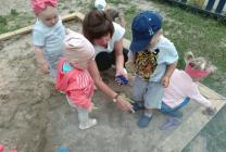 Дети группы раннего возраста "Малышки" (воспитатель Морозова О.Н.) вместе с мамой Кати - Картанович Светланой Павловной играли на участке: лепили песочные прянички и с удовольствием играли в мячик.