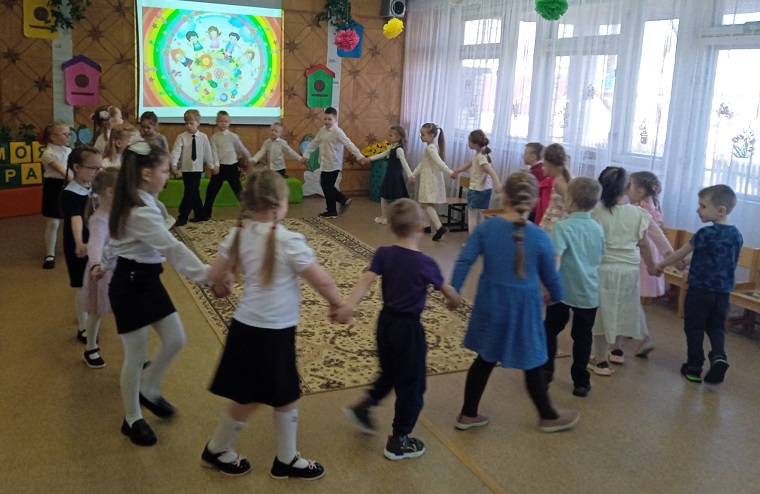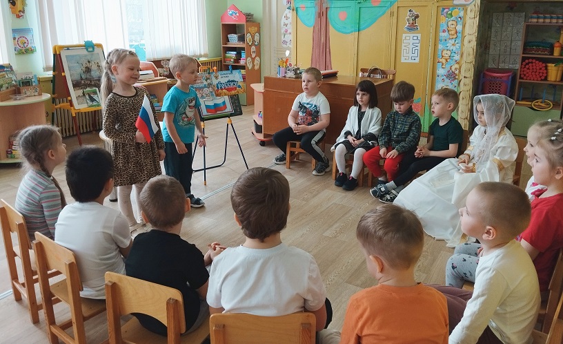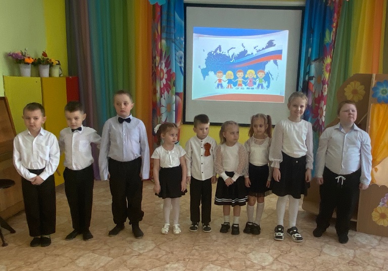 Ребята средней группы "Семицветик" (ул. Красноармейская, 26А) читали стихи о родной стране, её символах - флаге, русской берёзке, матрёшке, гармошке и о дружбе, водили хоровод дружбы. (воспитатель Горячева Анжела Анатольевна).