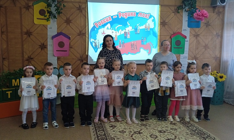 Воспитанники старшей группы "Почемучки" и подготовительной группы "Радуга" (ул. Ленина, 5) приняли участие в торжественном мероприятии. Дети слушали гимн нашей страны, исполняли песни о России, ️беседовали о нашей Родине. Выразительно и эмоционально прозвучали стихи разных поэтов о нашей большой стране, о дружбе народов. Каждый участник был отмечен памятным дипломом.