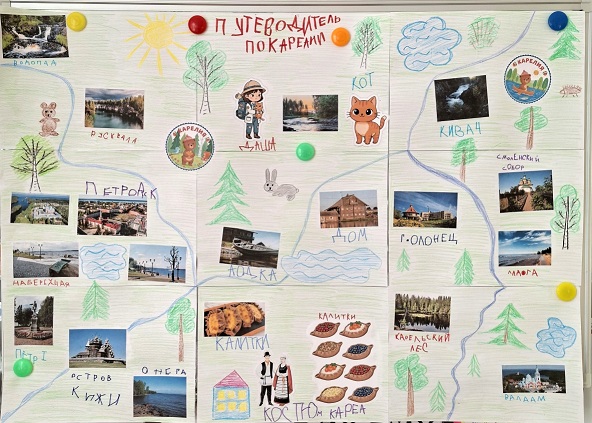 – Наша страна большая и многонациональная. Много в ней разных народов. У каждого своя история, свои традиции. И знакомиться с ними – одно удовольствие! Этнографию невозможно изучать сидя дома, поэтому Даша постоянно путешествует. Вернее, ездит в специальные командировки и этнографические экспедиции. И ездит она не одна, а со своим котом по кличке - Апельсинкин. Вместе с новыми знакомыми мы отправились в путешествие! Как вы думаете, куда? Конечно же, с нашими новыми друзьями мы отправились путешествовать по нашей любимой Карелии! С помощью интерактивной презентации мы рассматривали достопримечательности нашей Республики, карельские дома и костюмы карел, а также узнали о карельских калитках, вкус которых очень понравился Даше! После нашего путешествия в группе у ребят появился настоящий детский "Путеводитель по Карелии"!