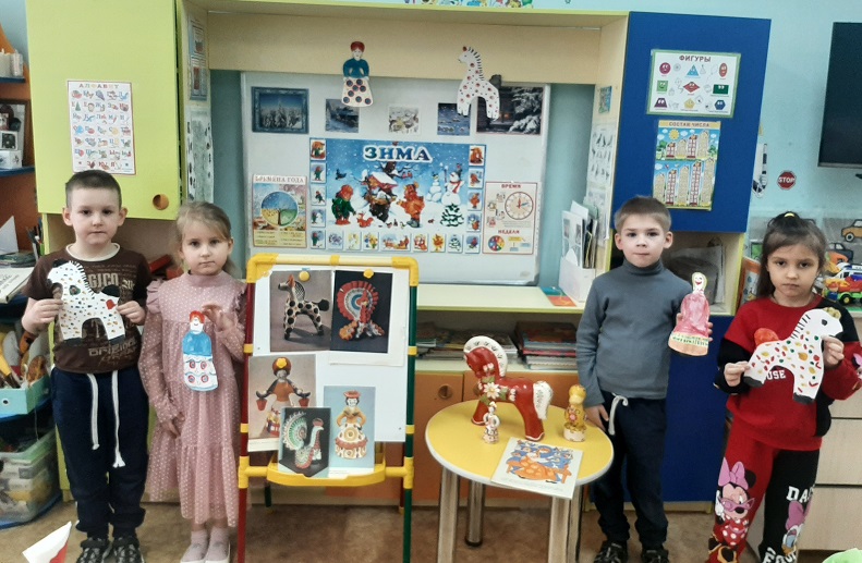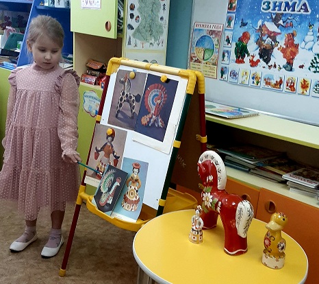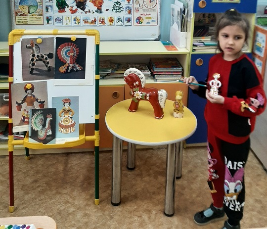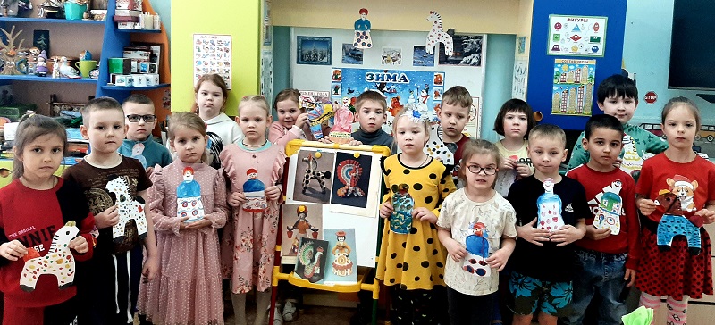 Дети подготовительной группы"Непоседы"совместно с воспитателем Тихоновой Ольгой Николаевной узнали о русских народных промыслах,об изготовлении народной игрушки из дерева,глины. Дети с удовольствием раскрасили силуэты Дымковских игрушек.