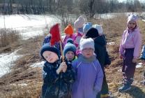 В целях повышения безопасности детей в период весеннего половодья и предупреждению возникновения несчастных случаев на водных объектах в весенний период дети подготовительной группы совершили целевую прогулку к рекам Мегрега и Олонка. Закрепили знания о весеннем половодье, опасности в воды. Наблюдали ,как прибывает вода весной в реках из-за таяния снега и льда.