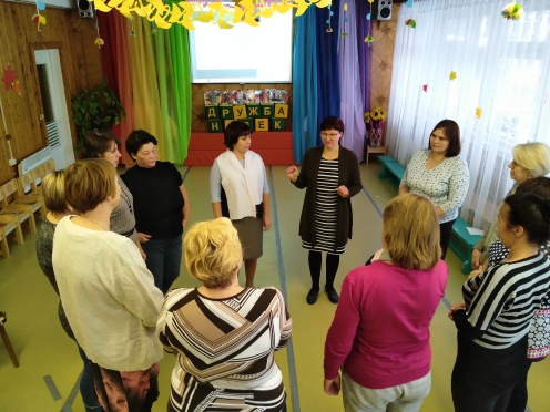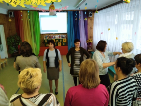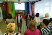 Практическую часть семинара провела Людмила Александровна Блинкова. Она рассказала о разных видах игр, применяемых в социо-игровой технологии, о правилах их проведения. Затем педагоги проиграли несколько игр на развитие внимания, коммуникативных навыков.
