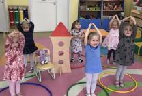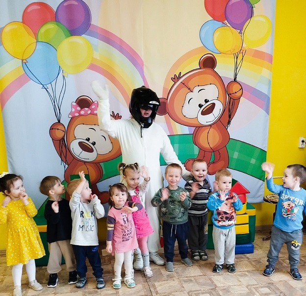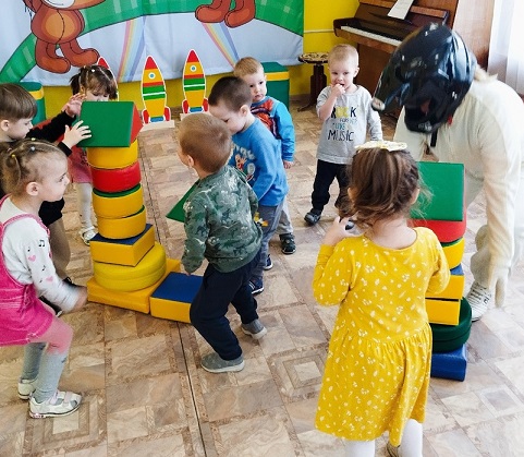 Малыши первой младшей группы «Гномики» (музыкальный руководитель Харитонова Анастасия Петровна) отправились в полёт на Луну с Космонавтом (в роли воспитатель Яковлева Евгения Геннадьевна).Здорово провели время, построили ракеты, выполнили космическую зарядку, убрали мусор, прошлись по звёздной дорожке, передали космический мяч. А по возвращению на землю станцевали дружный танец «Приседай».
