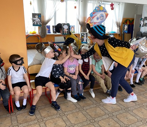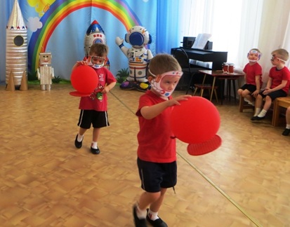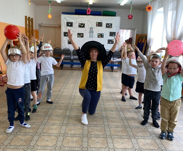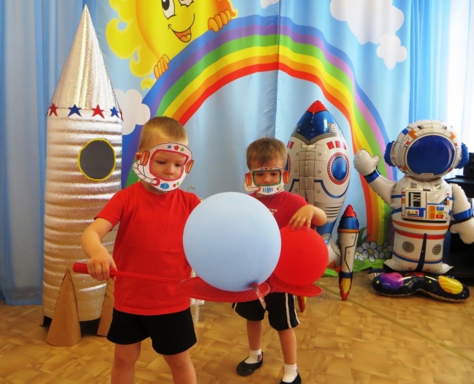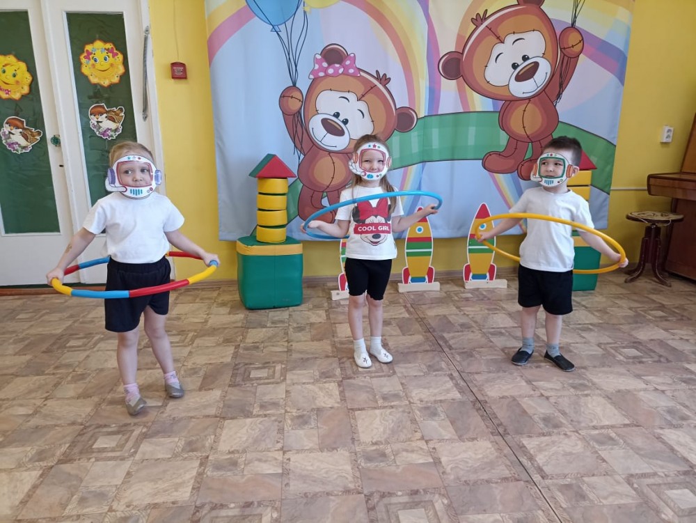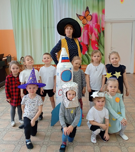 Юные космонавты младших и старших групп с музыкальным руководителем Дмитриевой Ириной Борисовной побывали в космическом путешествии. Они преодолели земное притяжения, почувствовали невесомость, не побоялись метеоритного дождя, высадились на далёкой планете и станцевали польку с инопланетянами. Прошло всё весело и задорно!