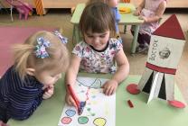 Дети подготовительной группы "Березка" (воспитатель Зайцева Елена Ивановна) рассматривали энциклопедии о космосе, делились впечатлениями. Во время занятия ребята не только получали новую информацию, но и с большим удовольствием раскрашивали и делали аппликацию «Космос», смотрели мультфильм о планетах и их особенностях, разгадывали загадки о космических объектах. А на прогулке с инструктором по физической культуре Марией Ивановной Андреевой прошла тренировка космонавтов.