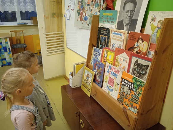3 ноября исполняется 135 лет со дня рождения известного русского поэта Самуила Яковлевича Маршака, который написал множество произведений для детей. В группах оформлены выставки произведений автора, в коридоре детского сада стенд "Иллюстрации советских художников к сказкам С.Я.Маршака"