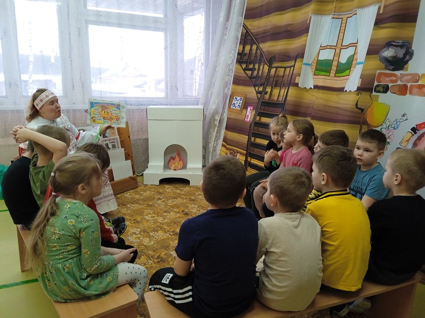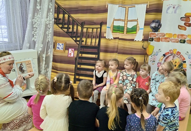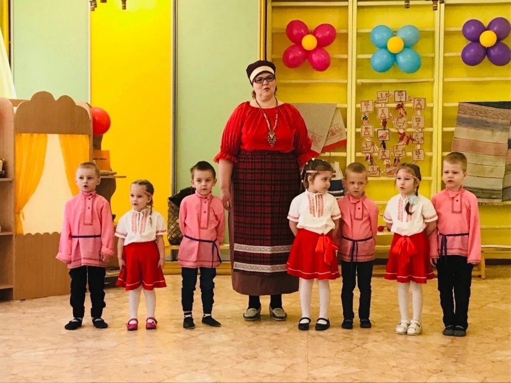 Воспитанники второй младшей группы "Крепыши", средней группы "Почемучки", старшей группы "Непоседы" и подготовительной группы "Затейники" с музыкальным руководителем Надеждой Николаевной Плинкоевой побывали в "Карельской горнице": закрепили зимние и весенние месяцы, дни недели, познакомились с народными праздниками, их традициями и обычаями. Вместе поиграли в знакомые карельские игры, исполнили мелодии на детских музыкальных инструментах.Закончилось мероприятие карельским танцем «Круугу».