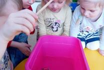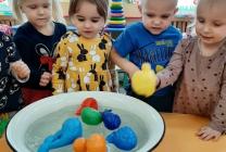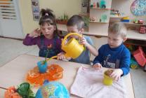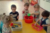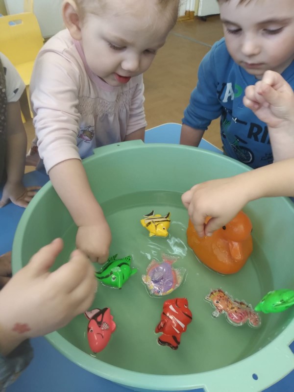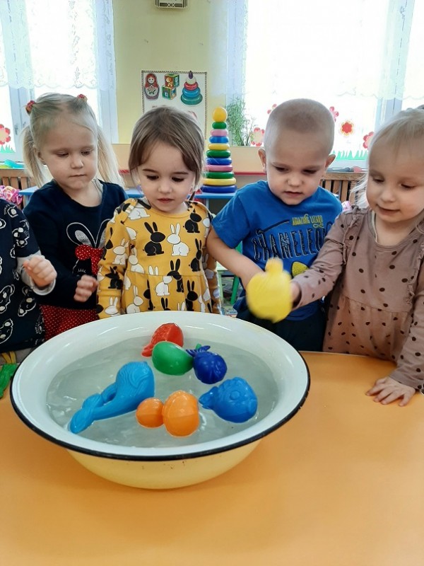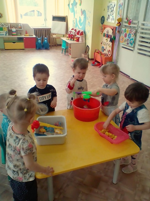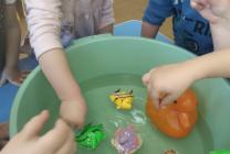 Дети первой младшей группы "Малинка" (воспитатель Коваленко Ж.С.) узнали зачем нужная людям вода и стали волшебниками - превратили прозрачную воду в баночках в разноцветную. Дети первой младшей группы "Малышки" (воспитатель Морозова О.Н.) и второй младшей группы "Ромашка" (воспитатель Чирикова А.Г.) побывали на рыбалке - ловили черпачком, удочкой не только рыбок поймали, но и разноцветные шарики.