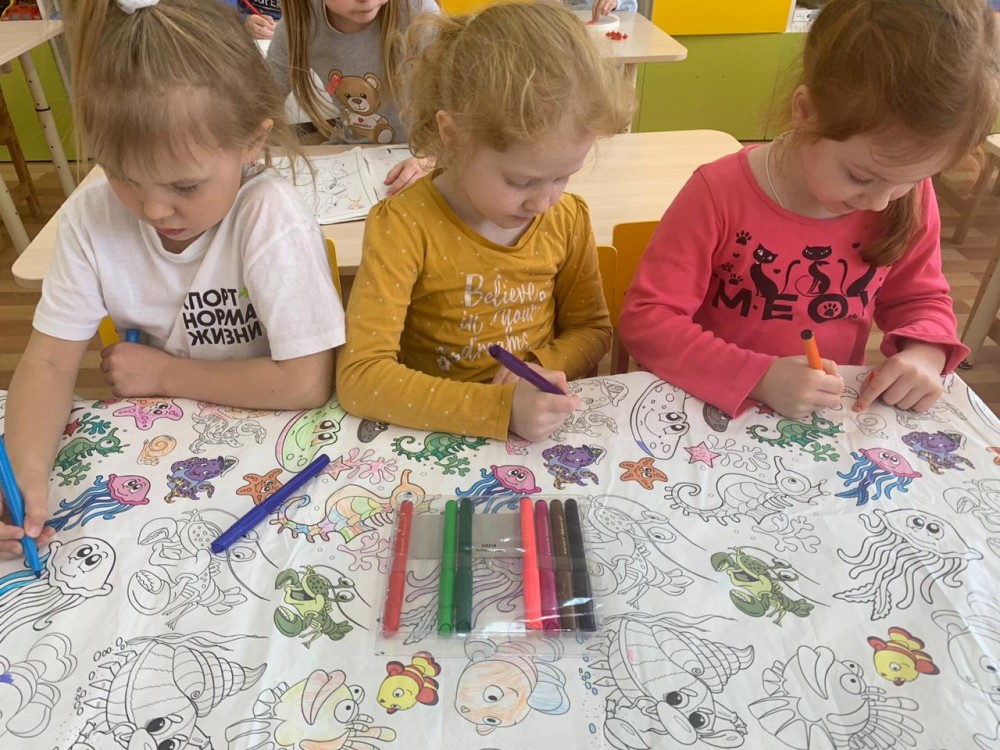Дети старшей группы "Рябинка" (воспитатель Зайцева Е.И.) выполнили коллективную композицию в командах на морскую тему, раскрашивали морских обитателей и ракушки. Проводили опыты с водой.