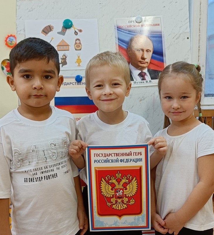 Ребята подготовительной группы «Березка» (воспитатель Зайцева Елена Ивановна) закрепили символы Российского государства .Государственный символ, который представляет из себя красный геральдический щит с золотым двуглавым орлом, утвержден указом президента в последний день осени 1993 года-герб России.