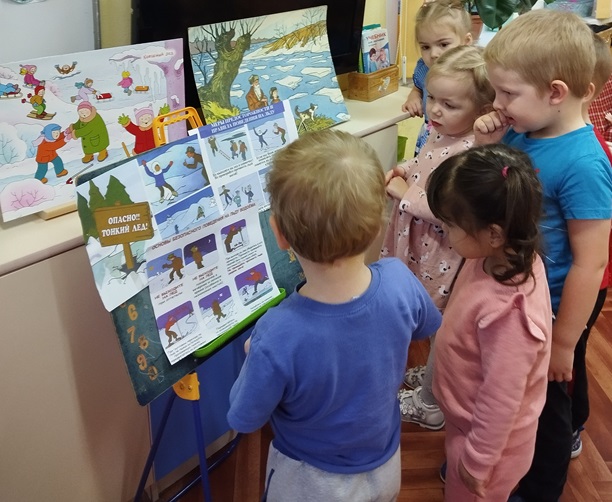 В первой младшей группе «Карамельки» (воспитатель Кириллова Елена Николаевна) малыши с педагогом рассмотрели картинки и обсудили ситуацию "Тонкий лед", "Дети на льду».