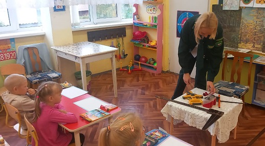 Дети группы "Затейники" на занятии по программе "Край родной" получили много эмоций и новых знаний от инженера по охране и защите леса ГКУ РК "Олонецкого центрального лесничества" Раппу Нины Михайловны, мамы Марии. Нина Михайловна подробно рассказала о своей профессии, показала различные инструменты, используемые в работе. Дети познакомились с формой одежды специалиста по охране леса. Свои впечатления о познавательной встрече дети изобразили в рисунках на тему "Бережем лес вместе!"