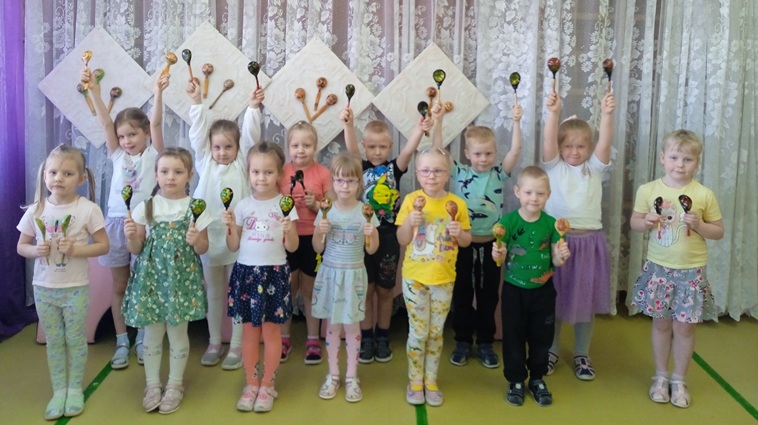 На тематическом музыкальном занятии дети средней группы "Почемучки", старшей группы "Непоседы" и подготовительной группы "Затейники" узнали от музыкального руководителя Надежды Николаевны Плинкоевой о том, как появилась деревянная ложка, как к ней относились в старину, как еще можно ее использовать. Вспоминали народные приметы, связанные с ложками: "Лишняя ложка на столе к обеду или к ужину – гостю незваному быть", "В качестве подарка нужно было принести ложку на новоселье, вместе с караваем хлеба, солью и деньгами", "Если уронить ложку – придёт женщина, если нож – мужчина". Повторили пословицы о ложках: