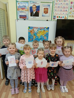 Дети старшей группы "Почемучки" с воспитателем Морозовой Оксаной Николаевной побеседовали о российской символике: о символическом значении цветов и образов (орел, держава, скипетр.) Узнали, что означает герб-это отличительный знак государства, изображенный на флагах, монетах, печатях, значках. Дети посмотрели презентацию и нарисовали герб своей семьи.