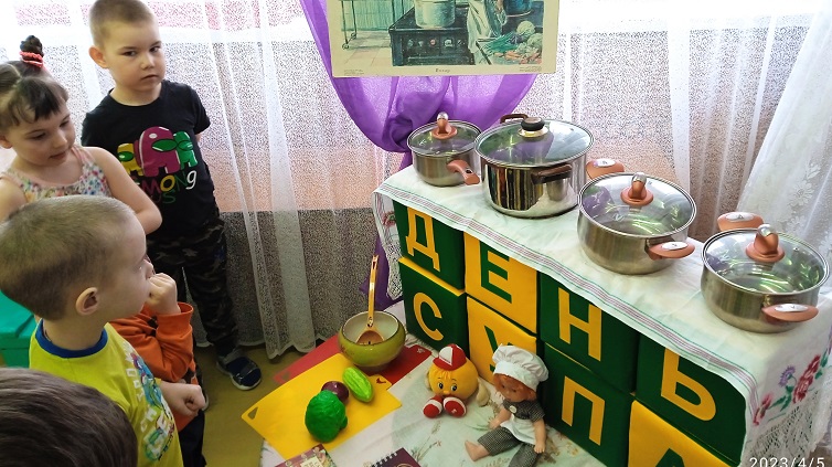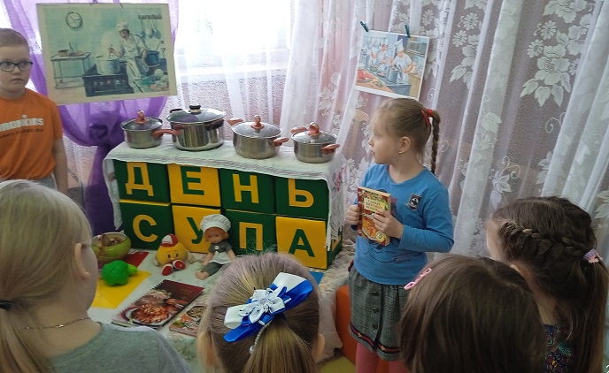 Дети первой младшей группы «Малышки», второй младшей группы «Крепыши», старшей группы «Непоседы» и подготовительной группы «Затейники» (педагоги А.А.Андреева, Г.В.Ананьева, Т.В.Корнышева, Е.А.Лазаренко, Н.Н.Плинкоева) познакомились сегодня с интересной мини - выставкой «День супа». Заметили на ней удобную посуду для приготовления супа, рассказали какие продукты нужны для приготовления супа и рассмотрели красивую книгу «Рецепты вкусной жизни». Дети закрепили знание о том, что суп – первое блюдо, узнали, что в мире насчитывается приблизительно 150 типов супов, которые подразделяются на более чем тысячу видов, при этом каждый рецепт имеет варианты. Исполнили ритмическую композицию «Мы- поварята». Теперь мы знаем, как полезен суп!