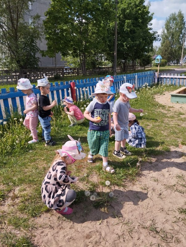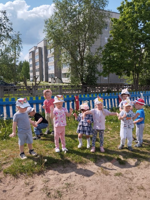 Малыши первой младшей группы "Малинка" с воспитателем Алексеевой Еленой Николаевной веселились на прогулке и играли в игру "Превращения на полянке".