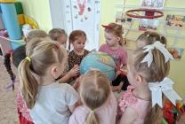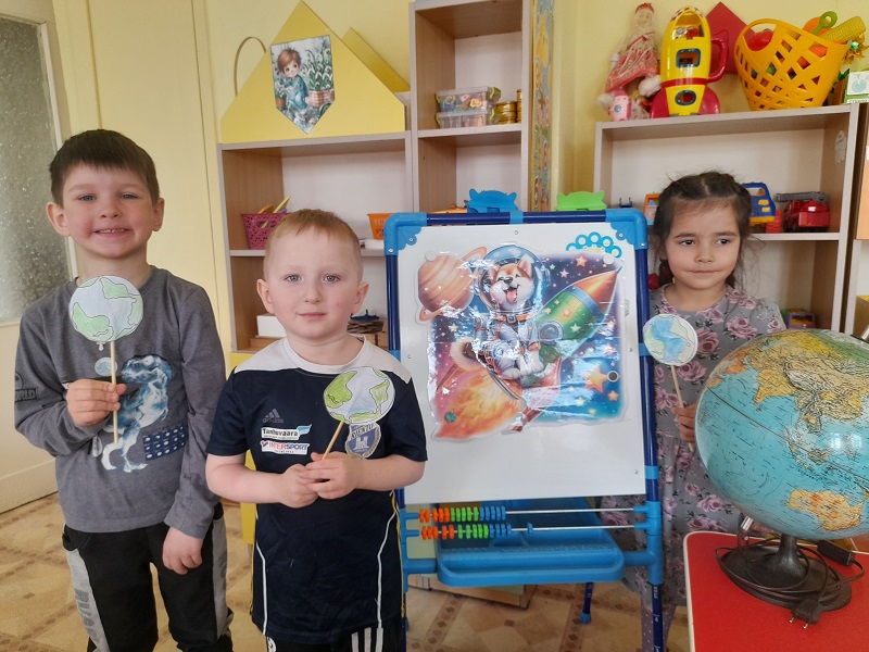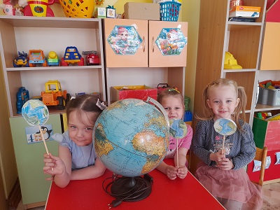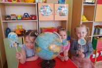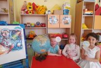 В средней группе "Солнышко" (ул. Ленина, 5) на занятии "Смотри на глобус, вот он шар земной" воспитатель Карпова Валентина Александровна познакомила ребят с глобусом, закрепила представления о внешнем облике Земли (горы, леса, пустыни, моря). Дети играли в игру "Быстрые ракеты", выполнили аппликацию "Наша планета Земля".