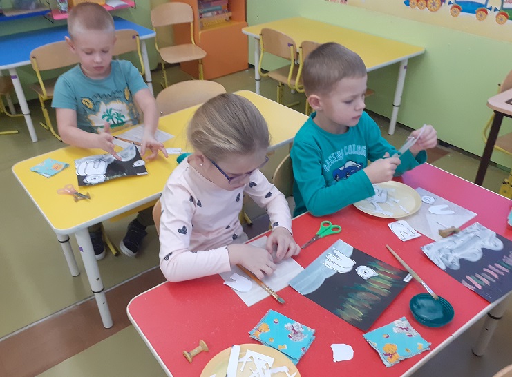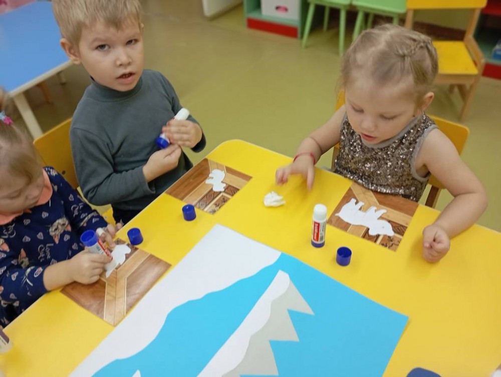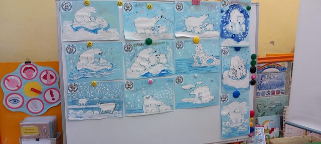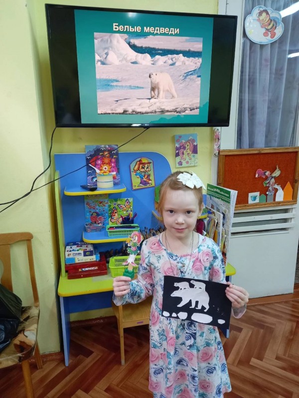 В старшей группе "Солнышко" (воспитатель Богданова Алина Александровна) на занятии дети встретились с Эколятами: Елочкой,Тихоней,Умницей и Шалуном и узнали, как живут белые медведи,чем питаются и как выживают в трудных условиях севера. Посмотрели видеоролик о белых медведях и их среде обитания. А в конце занятия слепили медведя, плывущего на льдине.