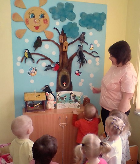 В группе раннего возраста "Одуванчик" (воспитатель Горячева А.А.) дети рассмотрели птиц на панно, отметили отличительные особенности, слушали голоса птиц, играли в игру" Птички летают".