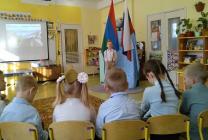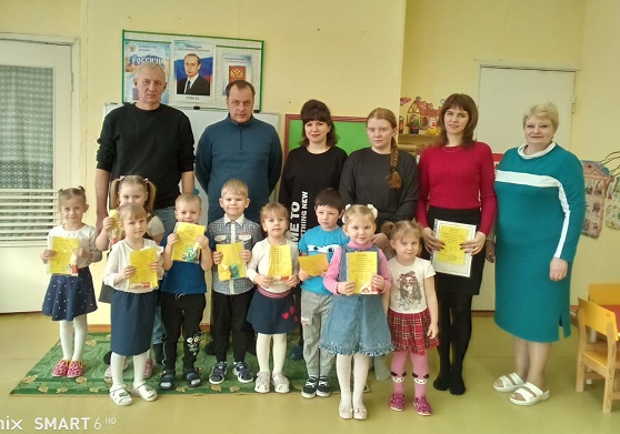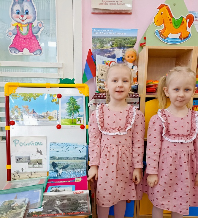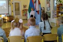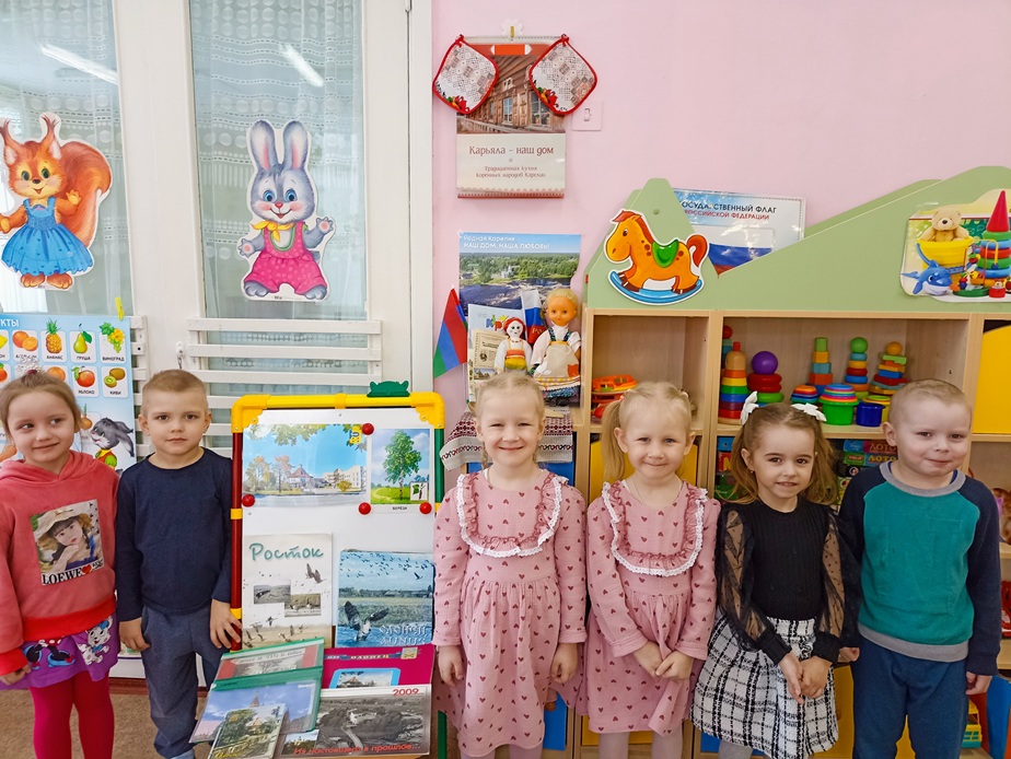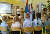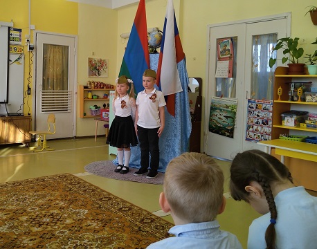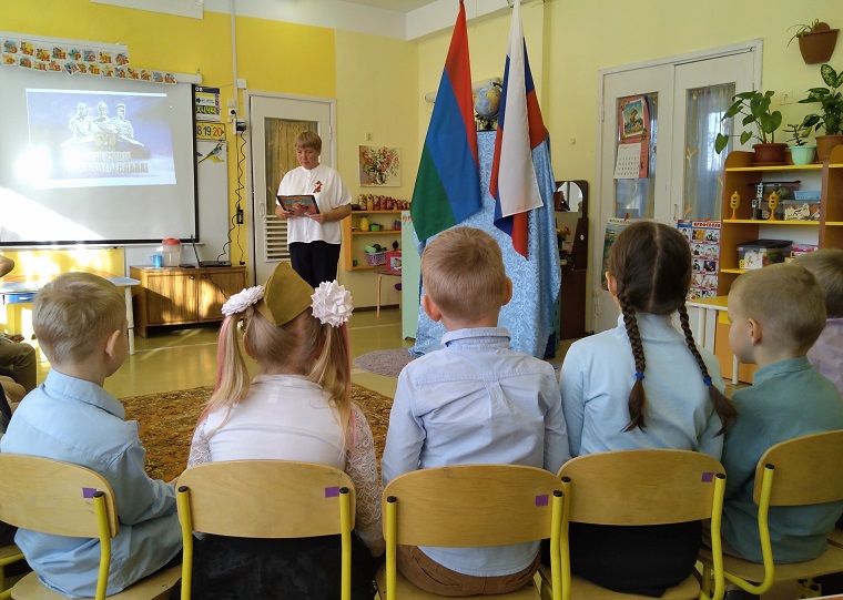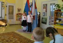 В подготовительной группе "Затейники" (воспитатель Бодян Лариса Алексеевна) для создания торжественности и значимости мероприятия были выставлены флаги Российской Федерации и Республики Карелия. Для осознания понятий "Родина" и "Доблесть" дети посмотрели видеоролики о войне.