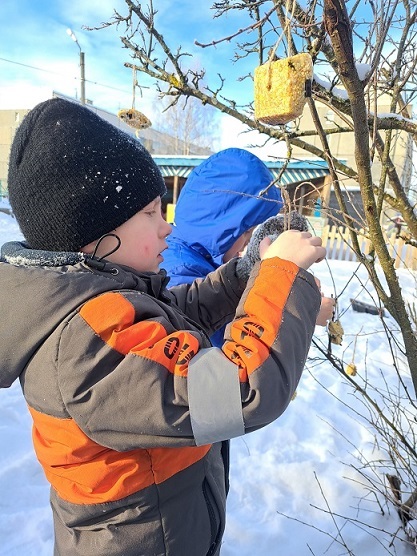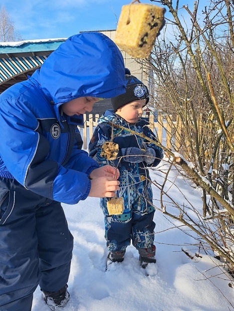 Ребята из группы "Земляничка" решили прийти на помощь своим маленьким пернатым друзьям. Они смастерили экологические кормушки для птиц. Старательно подготовили и раскрошили корм, разложили его по формочкам и, когда он застыл, привязали веревочки и развесили на кусты. Будем ждать птичек в гости.