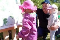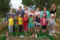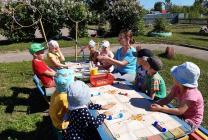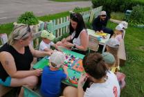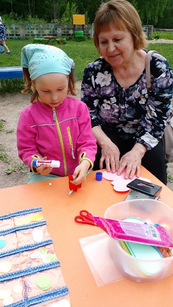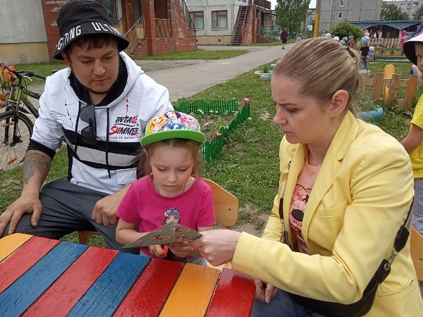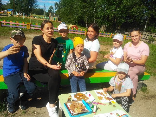 На площадке подготовительной группы «Березка» дети совместно с родителями увлеченно мастерили поделки из природного материала и бумаги: образы животных, птиц, рыб, насекомых, декоративные букеты (воспитатели Борисова И.В., Горячева А.А.).