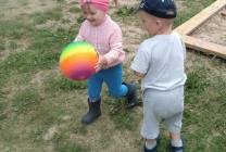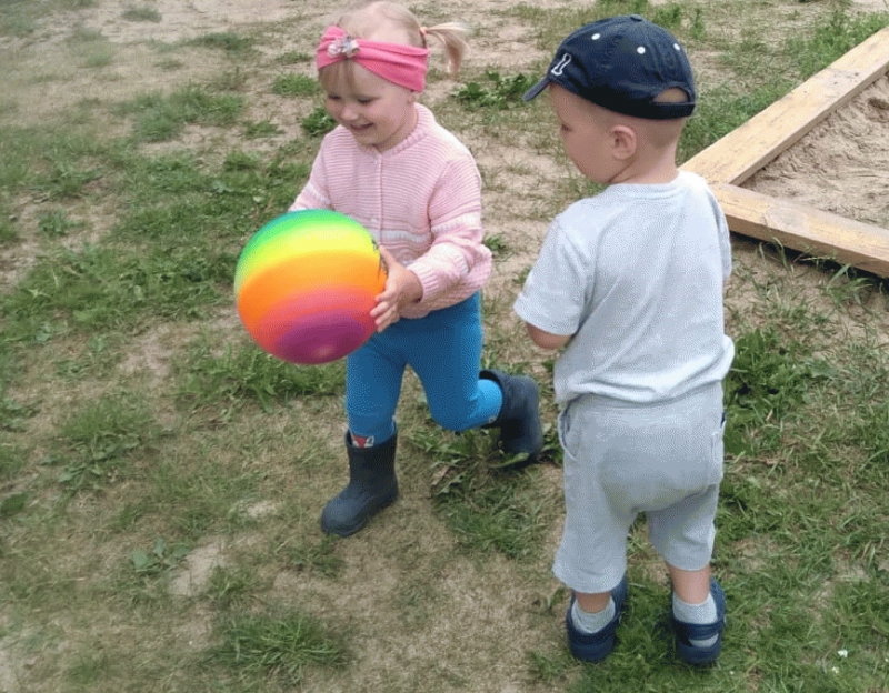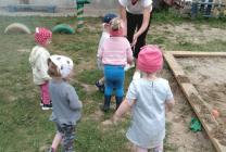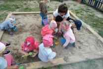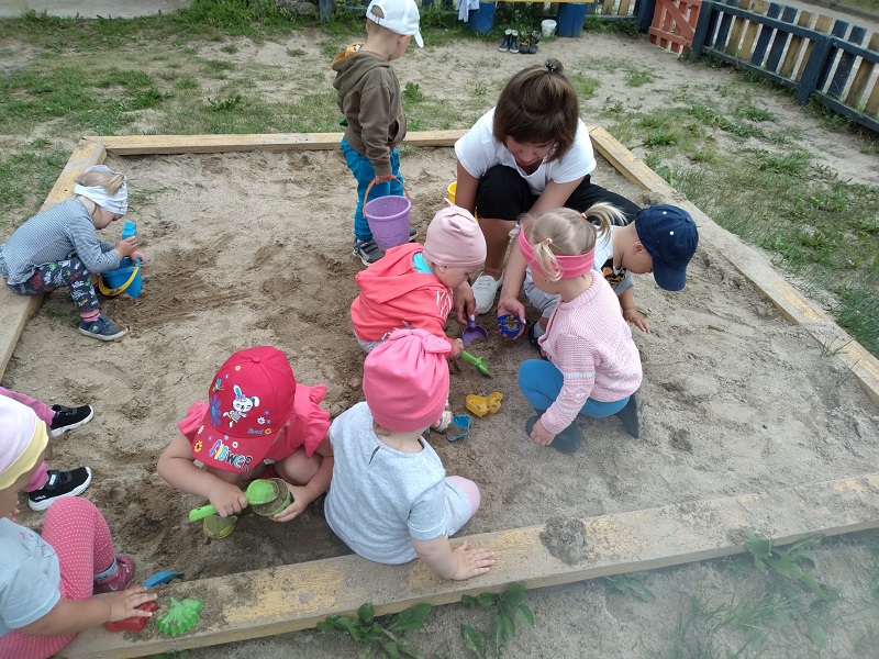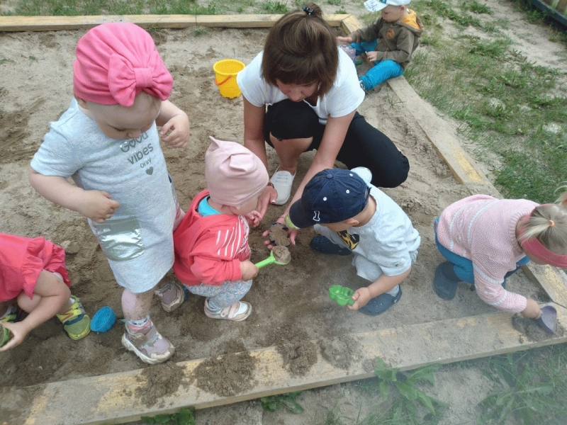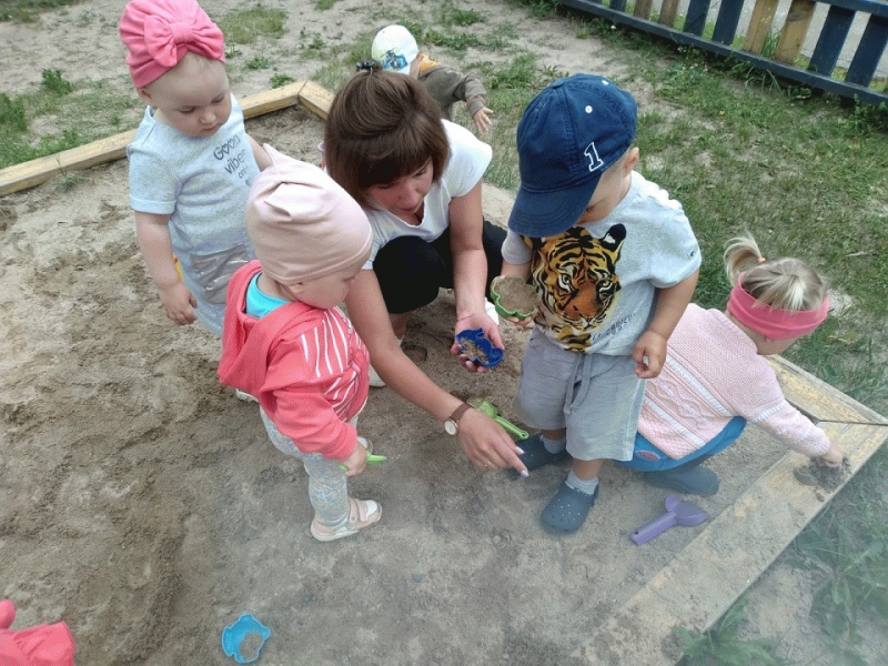 Дети группы раннего возраста "Малышки" (воспитатель Морозова О.Н.) вместе с мамой Кати - Картанович Светланой Павловной играли на участке: лепили песочные прянички и с удовольствием играли в мячик.