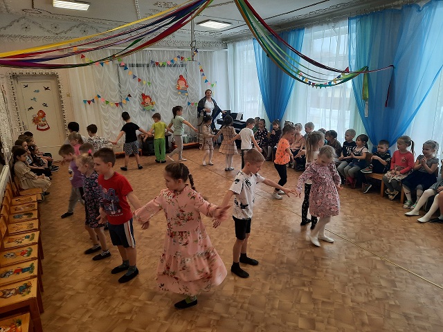 Дети групп "Карамельки", "Лучики", "Радуга", "Почемучки" (ул. Ленина, д.5) с педагогами Карповой Валентиной Александровной, Борисевич Натальей Леонидовной, Кирилловой Еленой Николаевной, Графовой Инной Евгеньевной, Пяркиевой Натальей Николаевной, Романовой Натальей Анатольевной, Богдановой Алиной Александровной от души веселились, водили хоровод, играли с Весной, Бабой Ягой и Скоморохом.