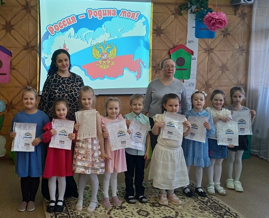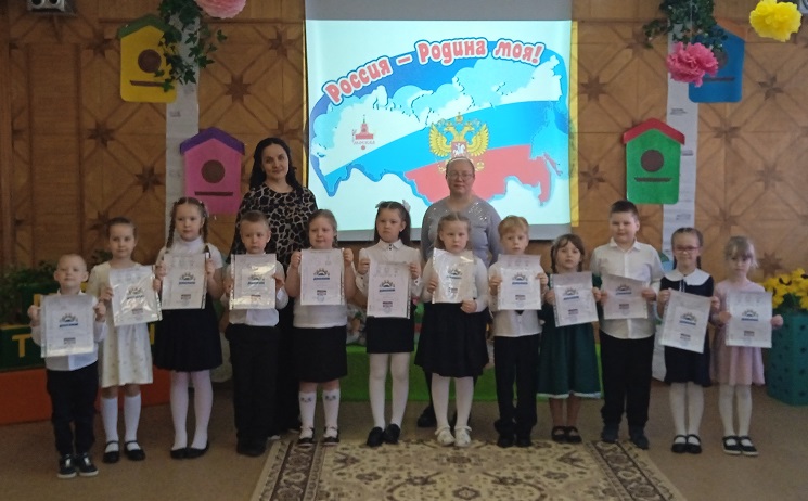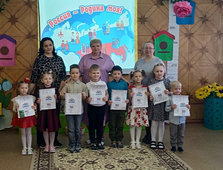 Воспитанники старшей группы "Почемучки" и подготовительной группы "Радуга" (ул. Ленина, 5) приняли участие в торжественном мероприятии. Дети слушали гимн нашей страны, исполняли песни о России, ️беседовали о нашей Родине. Выразительно и эмоционально прозвучали стихи разных поэтов о нашей большой стране, о дружбе народов. Каждый участник был отмечен памятным дипломом.