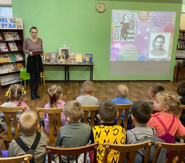 Старшая группа «Радуга» (воспитатель Богданова Алина Александровна) посетила детскую библиотеку. Ребята попали на увлекательное занятие, посвященное произведениям С.Я.Маршака. В игровой форме дети познакомились с интересными фактами из биографии писателя; смогли полистать книжки и посмотреть иллюстрации; с удовольствием одевали на скорость Рассеянного, по произведению «Вот какой рассеянный с улицы Бассейной»; собирали багаж для дамы, по произведению «Багаж»; и, на последок, посмотрели мультфильм «Где обедал воробей?»