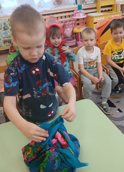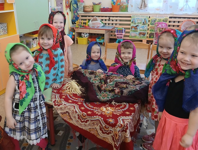 Дети второй младшей группы "Карамельки" (воспитатель Бодян Лариса Алексеевна) узнали много интересного о русских платках. О том, какие они бывают- дефиле "А платки на нас какие- В ярких красках расписные". Как можно использовать платок: пеленали кукол, собирали узелок в дорогу. И конечно играли- "Спрячь меня, платочек мой." Дети получили много положительных эмоций.