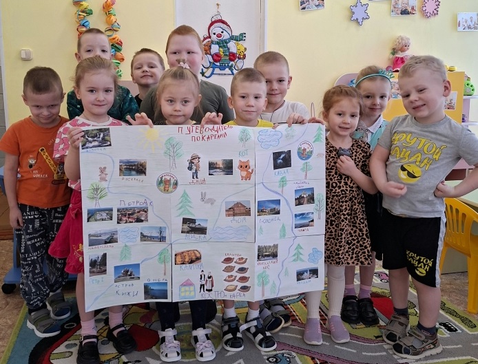 – Наша страна большая и многонациональная. Много в ней разных народов. У каждого своя история, свои традиции. И знакомиться с ними – одно удовольствие! Этнографию невозможно изучать сидя дома, поэтому Даша постоянно путешествует. Вернее, ездит в специальные командировки и этнографические экспедиции. И ездит она не одна, а со своим котом по кличке - Апельсинкин. Вместе с новыми знакомыми мы отправились в путешествие! Как вы думаете, куда? Конечно же, с нашими новыми друзьями мы отправились путешествовать по нашей любимой Карелии! С помощью интерактивной презентации мы рассматривали достопримечательности нашей Республики, карельские дома и костюмы карел, а также узнали о карельских калитках, вкус которых очень понравился Даше! После нашего путешествия в группе у ребят появился настоящий детский "Путеводитель по Карелии"!