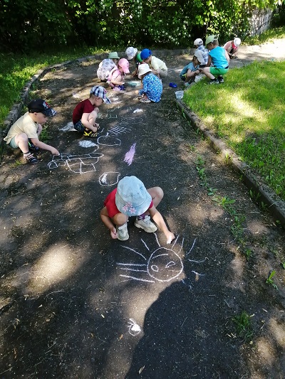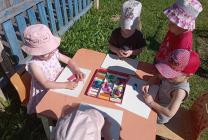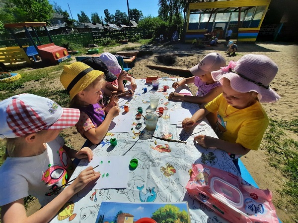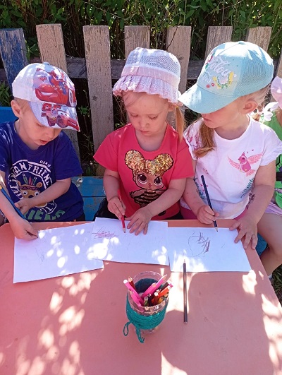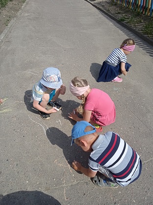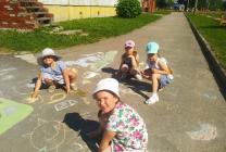 В день искусств и живописи ребята второй младшей группы "Крепыши" (воспитатель Блинкова Л.А.) с удовольствием говорили и рисовали о лете, о его красоте, пользе. Свои впечатления малыши изобразили карандашами, а вечером с удовольствием раскрасили серый асфальт яркими мелками. Дети старшей группы "Непоседы" (воспитатель Лазаренко Е.А.) рисовали на асфальте радужные, солнечные картины. Получился целый музей картин на асфальте. Дети подготовительной группы «Рябинка» с воспитателем Ригоевой Л.Н. рассматривали открытки с изображением картин разных художников, уточняли, что можно узнать о жизни людей в разные времена. Составляли натюрморт. На прогулке так же рисовали карандашами, мелками, мелом на асфальте, присоединившись к друзьям из подготовительной группы "Березка" (воспитатель Борисова И.В.).