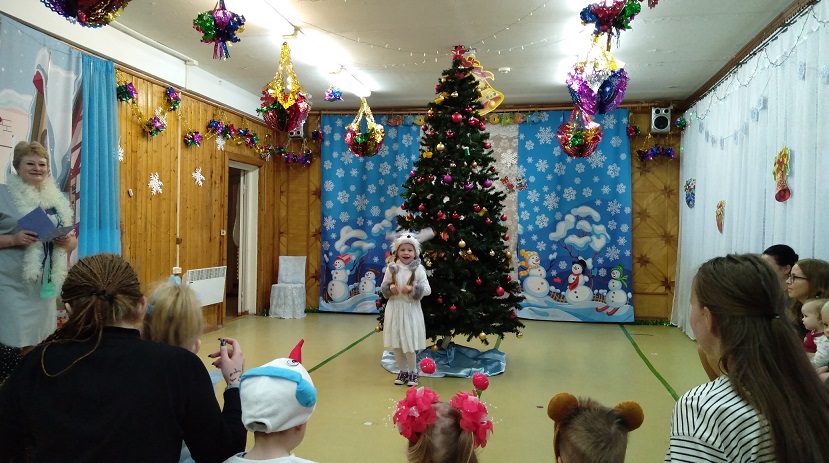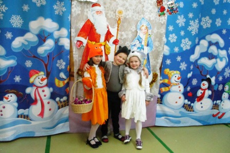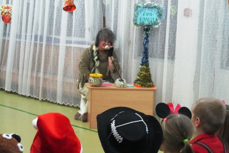 Дети средней группы "Почемучки" побывали на сказке "Лиса и Заяц" (Бодян Л.А., Блинкова Л.А., Андреева М.И., Пашина Т.И., Акимова С.М., Плинкоева Н.Н.). Хитрая Лиса забрала избушку у доброго Зайца и хотела испортить вместе с Волком праздник детям, но добрый Заяц нашел настоящего Деда Мороза и Снегурочку. Помогли Зайцу девочки-звездочки, показали путь в темном лесу. Мальчики исполнили танец "Часики". Украшением сказки стала сценка "По городам и селам". Дети были рады веселым играм с Дедушкой Морозом, праздничным хороводам и сладким подаркам.