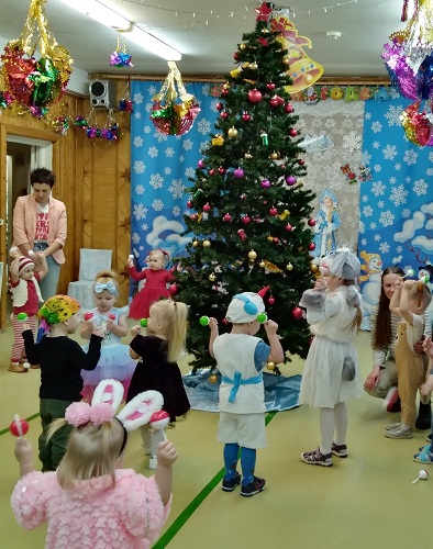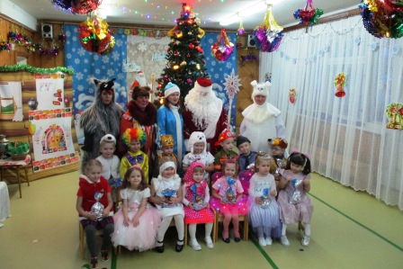 Дети первой младшей группы "Малышки" (Морозова О.Н., Пашина Т.И., Плинкоева Н.Н.) встретились на празднике с героями русских народных сказок: волком, зайцем, лисичкой (воспитанники подготовительной группы), которые принесли на праздник новогодние огоньки и зажгли елку разноцветными огнями.