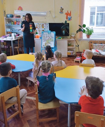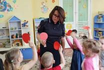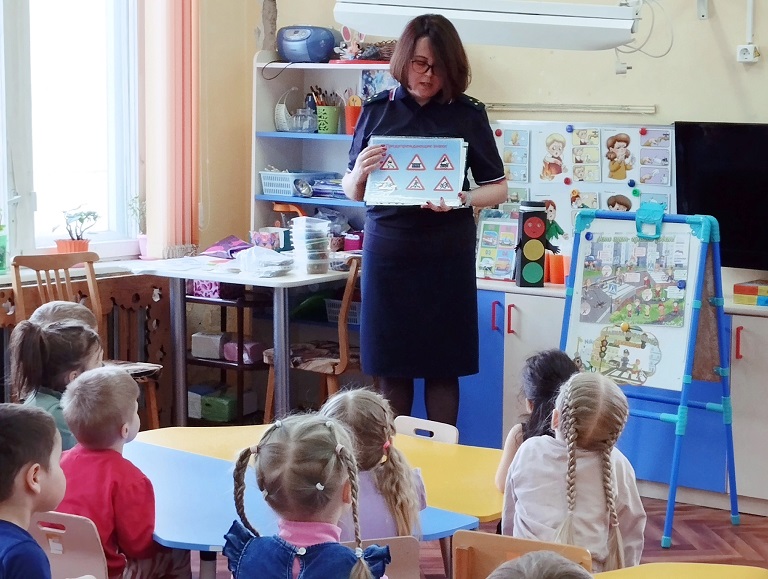 Дети второй младшей группы "Семицветик" (воспитатель Горячева Анжела Анатольевна) встретились с инспектором по пропаганде БДД ОГИБДД Осиповой Л.С. Любовь Сергеевна рассказала детям о безопасном поведении на дороге, чтобы не случилось беды, о работе светофора и назначении дорожных знаков. Ребята учились складывать знакомые дорожные знаки из 4 частей, раскрашивали их, поиграли в игру "Внимание, светофор!".