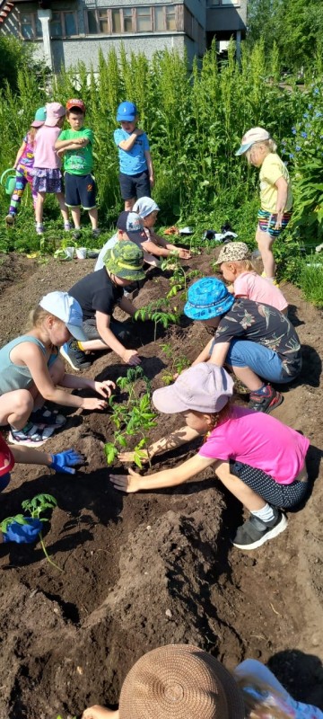В начале июня воспитанники средней группы "Почемучки" под руководством воспитателя Ананьевой Галины Васильевны трудились на огороде - высадили томаты, укроп, многолетние цветы на клумбы.