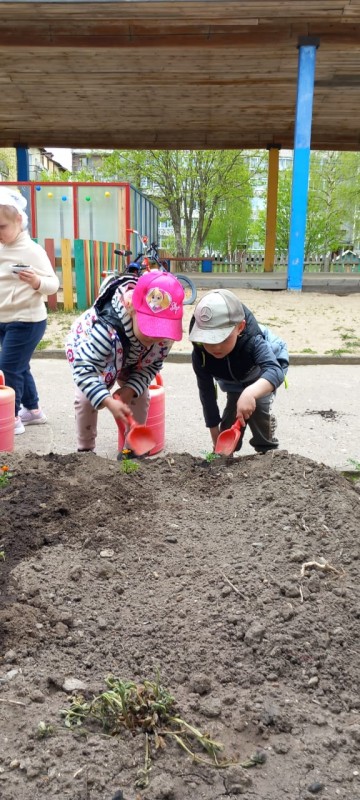 Наши воспитанники под руководством своих воспитателей дружно работают на огороде и цветнике: высаживают рассаду цветов, овощей; поливают ростки, рыхлят землю. Наблюдения и труд в природе - это важная часть воспитательной работы в детском саду.