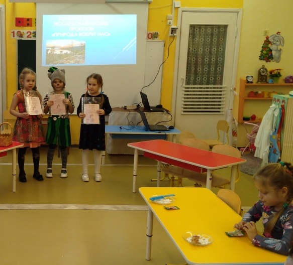 09 февраля конкурс прошел для детей подготовительных групп "Фиалка", "Василек", "Незабудка" (воспитатели Лекандер С.А., Генкель С.Ю., Тихонова А.Г.). Маленькие исследователи представили вниманию зрителей свои наблюдения, опыты и эксперименты. Камкова Алина рассказала о свойствах воздуха. Сысоев Иван выступил с экопроектом о защите живой природы. Ишукова Евангелина удивила всех присутствующих своим открытием новой зубной пасты. Елисеева Кира своим творческим выступлением вдохновила ребят на использование новой техники рисования.