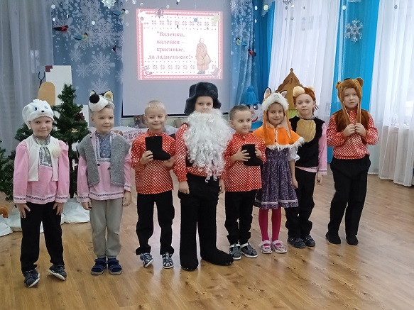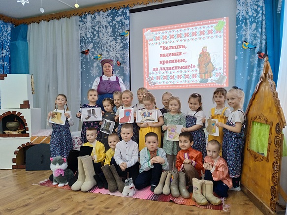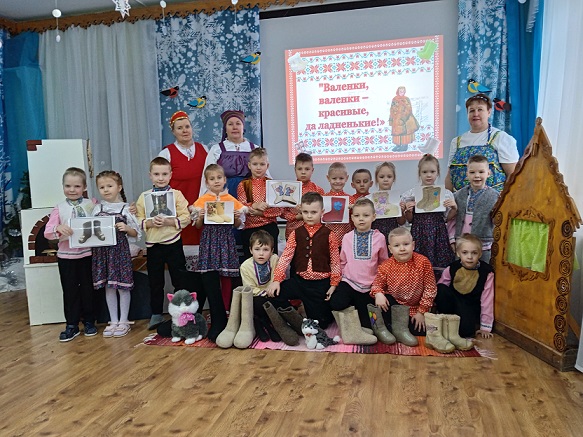 «Если в доме, на работе у вас валенки в почете, то мы вас своих друзей, приглашаем поскорей.» - этот девиз был на развлечениях, посвященных валенкам, в старшем дошкольном возрасте: «Рябинка», «Берёзка», «Непоседы», «Затейники». (педагоги: Генкель Светлана Юрьевна, Иванова-Плинкоева Зинаида Николаевна, Алексеева Елена Николаевна, Плинкоева Надежда Николаевна). Дети познакомились с историей появления валенок, процессом их изготовления. Ребята с удовольствием поучаствовали в «валенковых» эстафетах: «Хоккей с валенком», «Гуляли валенки по дорожке», «Валенковая лошадка». Соревнования прошли весело, победила - дружба! Дети группы «Берёзка» показали сценку «История о том, как валенки убежали».