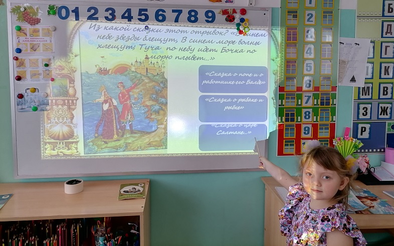 Ребята посмотрели презентацию и познакомились с биографией поэта, узнали, что маленький Саша жил в большой семье, рос умным ребёнком и начал писать стихи очень рано — в три года. А любовь к чтению ему привила любимая няня — Арина Родионовна. Она знала много сказок очень хорошо их рассказывала.