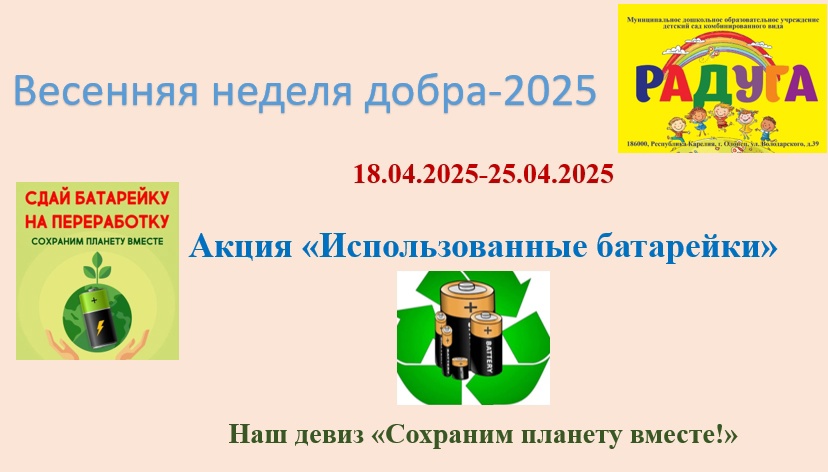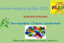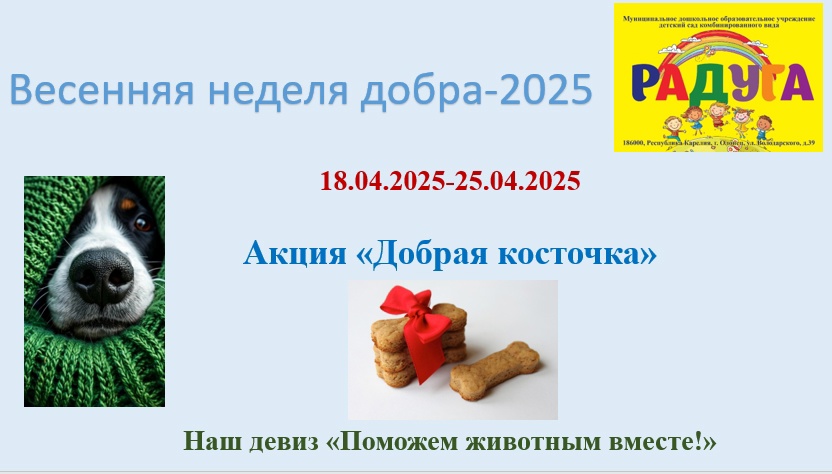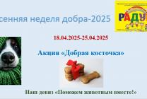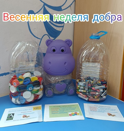 18 апреля в детском саду стартовала Весенняя Неделя добра. Ежегодна наши воспитанники, педагоги и родители принимают в ней самое активное участие. Не останемся в стороне и в этом году. Мы объявили несколько акций: "Добрая косточка" - сбор корма для приюта собак; "Добрые крышечки" - сбор пластиковых закручивающихся крышечек от различных емкостей/, которые пойдут на переработку и изготовление новых предметов быта; "Использованные батарейки/" - сбор бывших в употреблении батареек для утилизации и недопущения загрязнения территории. 21 апреля во всех дошкольных группах детского сада пройдет еще одна акция "Открытка солдату". Мы приглашаем родителей воспитанников также присоединиться к изготовлению поздравительной открытки участникам СВО с 80-летием Великой Победы. Для вас педагоги приготовят необходимые материалы для творчества. Для каждой открытки подготовлен конверт с логотипом 80-летия Победы. Все изготовленные открытки участниками акции будут отправлены в зону СВО. Для участия в акции можно подать заявку на сайте Добро.ру.