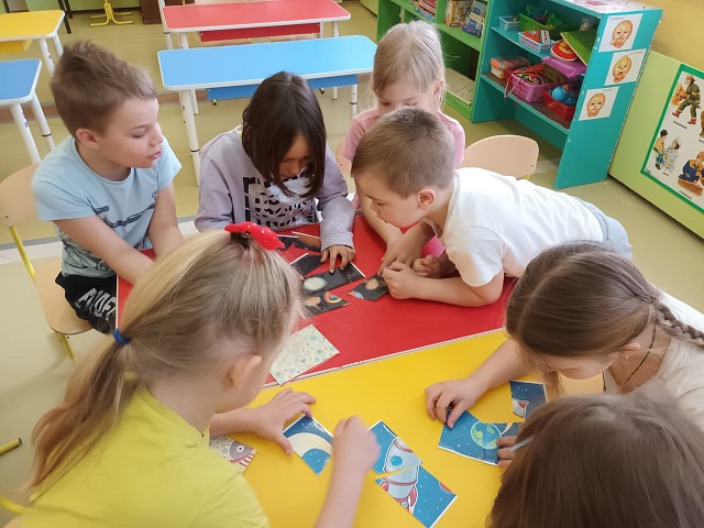 Дети подготовительной группы "Затейники" (воспитатель Андреева М.И.) играли в космические игры : пазлы, "Запуск ракеты", "Чья ракета быстрее!".