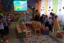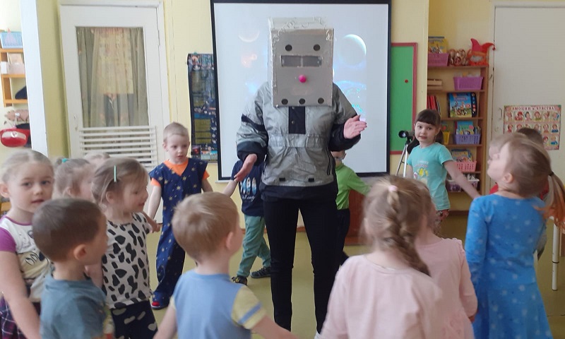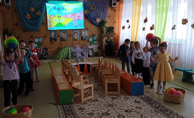 Воспитанники старшей группы "Непоседы" и подготовительной группы "Затейники" (музыкальный руководитель Плинкоева Н.Н., воспитатели Андреева М.И., Корнышева Т.В.) на космическом празднике совершили "Полет в космос": "летели на ракете", "Облетели Землю", "приземлялись" на разных планетах, познакомились с "инопланетными обитателями".