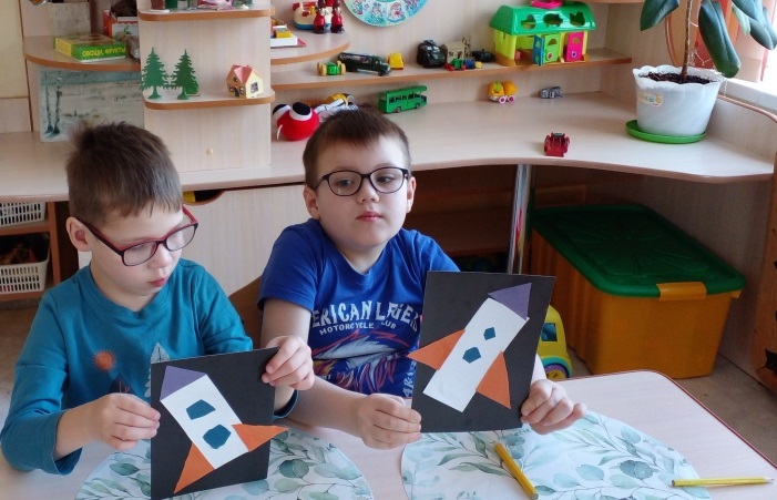 В группе "Земляничка" (воспитатель Бондаренко М.А.) во время беседы дети отгадывали загадки, собирали деревянный пазл "Ракета", рассматривали энциклопедию о космосе, смотрели познавательную презентацию и выполнили аппликацию.